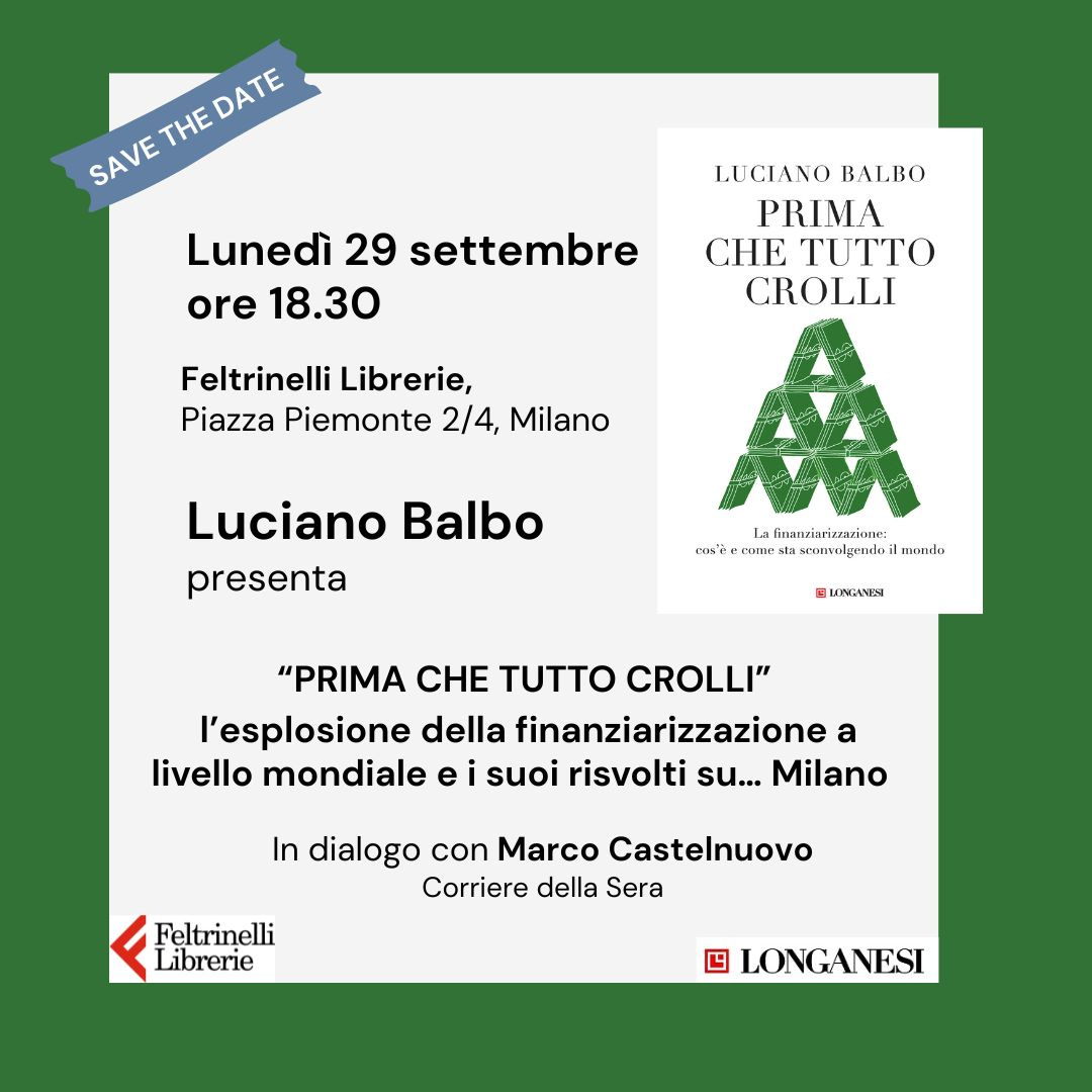 PS: il 29 Settembre alle 18.30 presenterò’ il mio libro “ Prima che Tutto Crolli” alla libreria Feltrinelli di Corso Vercelli/Piazza Piemonte a Milano. Sarà un dialogo con Marco Castelnuovo, responsabile della pagina di Milano del Corriere. Cercherò di prendere spunto dalle tesi del libro per applicarle alle tematiche dello sviluppo immobiliare ed economico della città.